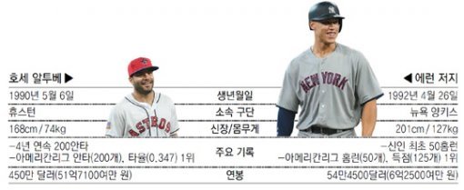 야구에 최적화된 체형은 무엇일까. 2017시즌 메이저리그 아메리칸리그(AL) 최우수선수(MVP) 경쟁을 보며 품을 법한 의문이다. 외형적으로 너무나도 상반된 두 선수가 단 하나뿐인 최고의 자리를 향해 질주하고 있다. ‘작은 거인’ 휴스턴의 2루수 호세 알투베(27·168cm)와 ‘괴물 신인’ 뉴욕 양키스의 우익수 에런 저지(25·201cm)가 그 주인공이다.
