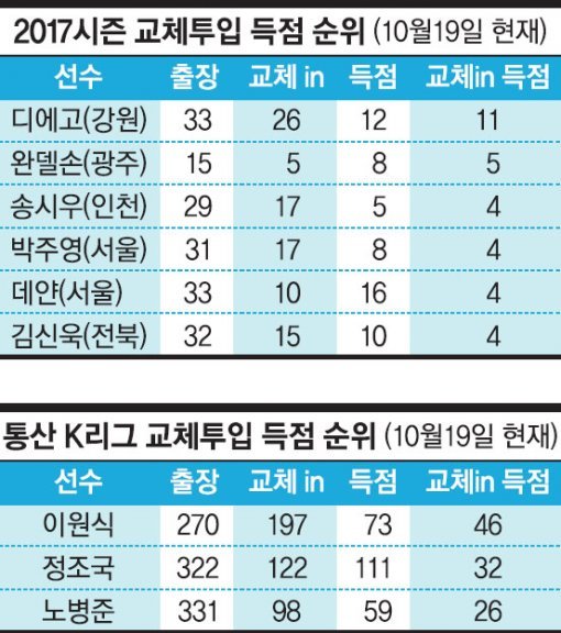 올 시즌 클래식(1부) 총 득점(10월19일 현재)은 560골인데, 교체 투입 후 득점은 17.3%인 97골이다. 97골 중 결승골은 25회다. 강원 디에고가 4골로 가장 많고, 강원 문창진과 서울 데얀이 각각 2회씩을 기록했다.