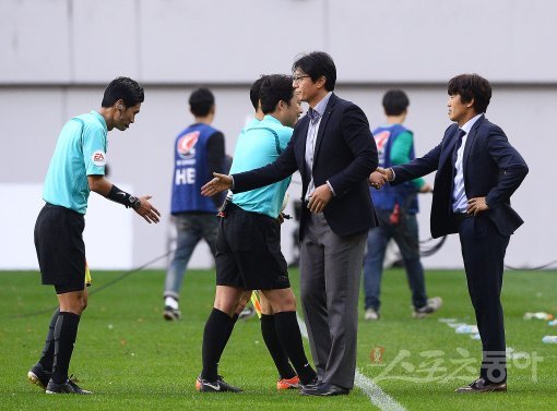 21일 서울월드컵경기장에서 열린 ‘KEB하나은행 K리그 클래식 2017’ 35라운드 FC서울과 수원삼성의 89번 째 슈퍼매치 경기에서 양 팀이 치열한 공방전 끝에 2-2 무승부를 거뒀다. 경기 후 FC서울 황선홍 감독과 수원삼성 서정원 감독(오른쪽)이 심판들과 악수를 나누고 있다. 상암 | 김진환 기자 kwangshin00@donga.com