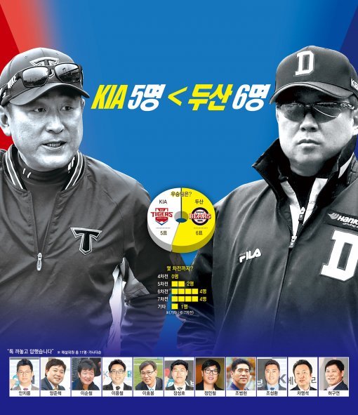 두산이 3년 연속이자, 통산 6번째 KS 우승을 달성하려면 PO에서 의문부호를 드리운 에이스 니퍼트의 부활이 절실하다는 전문가들이 4명이었다. 허리 부상으로 PO 4차전에 결장한 포수 양의지, PO에서 3홈런 9타점으로 4번타자의 임무를 100% 완수한 김재환을 키플레이어로 점찍은 전문가도 2명씩이었다. 팀 전체적으로는 PO에서 NC 마운드를 초토화한 타선, KIA 불펜에는 없는 함덕주라는 롱릴리프, 탄탄한 백업자원 등이 ‘V6’의 원동력으로 작용할 것이란 분석도 있었다.