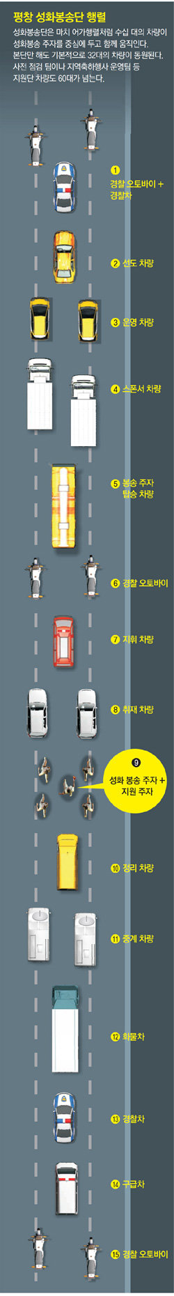 평창 성화는 내년 2월 9일 평창에 도착할 때까지 한 명의 봉송 주자를 4명의 지원 주자가 둘러싸는 방식으로 전국 17개 시도를 돈다. 장소에 따라 약간씩의 차이가 있지만 성화봉송단이 이동할 때마다 기본적으로 32대의 차량이 동원된다. 경찰 오토바이가 봉송단 앞뒤를 호위하는 가운데 봉송 운영 차량과 취재 차량, 스폰서 차량, 구급차 등이 함께 움직인다. 여기에 사전 점검팀, 물자 운송팀, 지역축하행사 운영팀 등 지원 차량까지 더해지면 100대가 넘는 차량이 성화를 중심으로 한 번에 이동하는 장관이 펼쳐질 것으로 전망된다. 성화가 전국을 돌 때는 지역마다 마련된 임시성화대에 불을 붙여 성화를 보관한다.