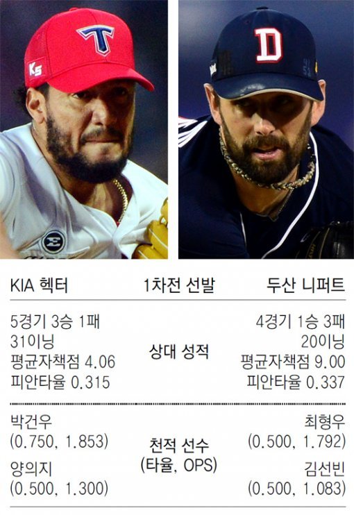 통산 11번째 우승에 도전하는 KIA의 믿을 구석은 한국시리즈 통산 10전 10승의 대역사를 쓴 타이거즈의 자부심이다. 더욱이 올해는 시즌 전부터 대권 도전을 천명했을 만큼 투타도 고루 탄탄하다. 기선 제압을 좌우할 원투펀치 역시 압도적이다. 김기태 감독이 한국시리즈 1차전 선발로 헥터를 발표하며 “20승 에이스 중 키 순서로 정했다”고 농담할 정도다. 20홈런 타자만 5명이 즐비한 타선 역시 위력적이다.