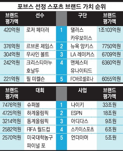 가장 관심을 끈 선수부문 1위는 페더러가 선정됐다. 약 420억원의 가치를 인정받아 2년 연속 선두 자리를 지켰다. 2위는 376억원을 기록한 미국프로농구(NBA) 르브론 제임스(33·미국), 3위는 304억원으로 평가받은 육상 스타 우사인 볼트(31·자메이카)가 차지했다.