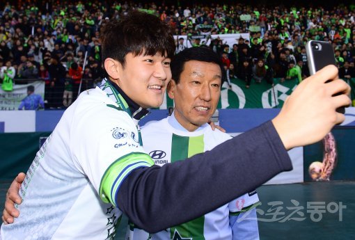 유공∼울산현대에서 210승을 기록한 김정남 감독(한국OB축구회 회장), 한일은행∼울산∼수원삼성∼대전 시티즌에서 207승을 쌓은 김호 감독만이 했던 대기록과 어깨를 나란히 했다. 그 것도 최단기간에. 자신을 국가대표로 키워주고(김호), 국가대표로 선발해준(김정남) 스승들과 같은 반열에 선 제자는 오직 전북만 이끌며 대기록을 썼다.