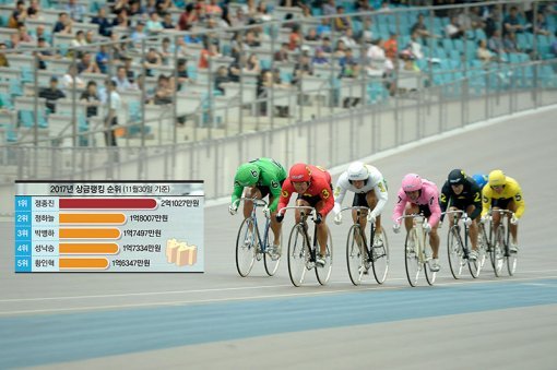 12월 마지막 날까지 아무도 모른다. 총상금 2억5400만원이 걸린 문화체육관광부장관배 그랑프리 경륜 결승이 올 시즌 상금왕 타이틀을 노리는 선수들의 희비를 좌우할 것으로 보인다. 유력한 후보는 상금왕 2연패를 노리는 정종진. 그 뒤를 정하늘, 박병하, 성낙송이 뒤집기를 노리며 추격하고 있다. 상금랭킹(2017년 11월30일 기준) 상위권 선수들을 통해 올시즌 상금왕 타이틀의 향방을 가늠해 본다. 상금에는 후보·대기일수 등에 따른 각종 수당이 포함돼 있으며, 광명(2006년 이전 잠실) 출전결과만이 반영됐다.