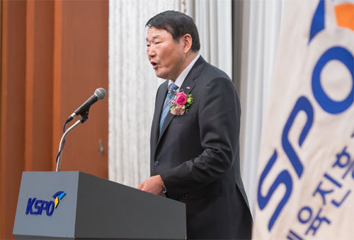 조재기 국민체육진흥공단 제12대 이사장이 22일 서울 송파구 서울올림픽파크텔에서 열린 취임식에서 취임사를 하고 있다. 1976년 몬트리올 올림픽 유도 동메달리스트 출신 조 이사장은 2021년 1월까지 공단을 이끈다.