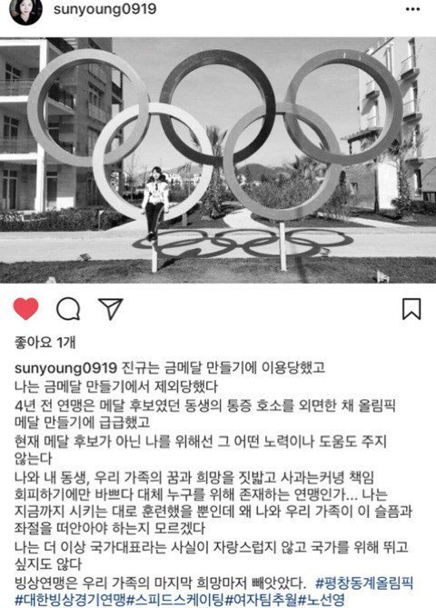 노선영은 “4년 전 연맹은 메달 후보였던 동생의 통증 호소를 외면한 채 올림픽 메달 만들기에 급급했고 현재 메달 후보가 아닌 나를 위해선 그 어떤 노력이나 도움도 주지 않는다”고 썼다.