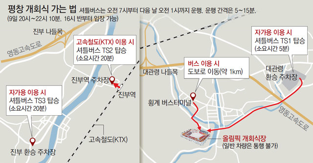 교통 흐름이 원활하면 서울 광화문에서 대관령 주차장까지 자가용으로 2시간 반이 걸린다. KTX는 서울역에서 진부역까지 1시간 20분이 소요된다. 개회식은 오후 8시 시작되며 식전 행사는 오후 7시에 막을 올린다. 행사장은 4시 반부터 입장할 수 있다. 보안 검색 시간을 감안하면 오후 5시까지는 대관령 또는 진부 환승주차장에 도착하는 게 좋다.