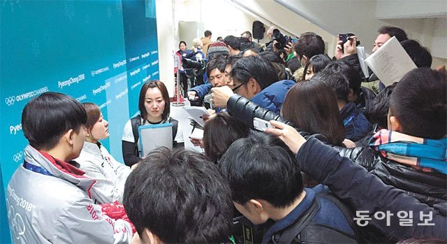 일본 취재진이 21일 강릉컬링센터에서 열린 평창 겨울올림픽 여자 컬링 최종 예선전에서 4강 진출을 확정한 일본 여자 컬링 대표팀 ‘팀 후지사와’에 질문을 하고 있다. 강릉=김동욱 기자 creating@donga.com