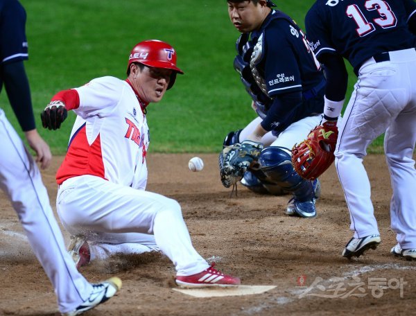 26일 광주-기아 챔피언스 필드에서 ‘2017 타이어뱅크 KBO리그’ 포스트시즌 한국시리즈 2차전 두산베어스와 KIA타이거즈 경기가 열렸다. 8회말 1사 1,3루 KIA 나지완 3루수 앞 땅볼 때 3루주자 김주찬이 협살에 걸렸으나 홈으로 달려 선제 득점에 성공하고 있다. 광주 | 김종원 기자 won@donga.com