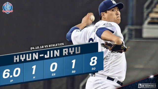 류현진은 11일(한국시간) 미국 캘리포니아주 다저스타디움에서 열린 오클랜드와 홈경기에 선발 등판해 6이닝 1피안타 1볼넷 8탈삼진 무실점하며 활약했다.
