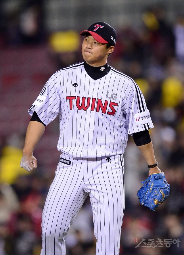 11일 서울 잠실야구장에서 ‘2018 신한은행 MY CAR KBO리그’ SK와이번스와 LG트윈스 경기가 열렸다. 선발 투수로 등판한 LG 김대현이 6회초 1사 1루 상황에서 SK 이재원을 병살타로 처리한 후 주먹을 쥐고 있다. 잠실 | 김종원 기자 won@donga.com