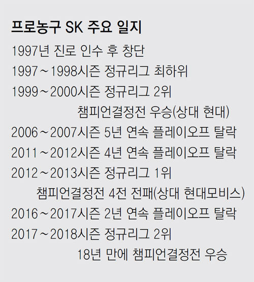 3점 차 SK의 리드. DB 디온테 버튼이 빠르게 상대 진영으로 넘어가 3점슛을 던졌지만 림을 벗어났다. SK가 18년 만에 프로농구 정상에 올라서는 순간이다. 안정적 경기 운영과 악착같은 수비를 보여준 SK 주장 김선형(7득점 2블록슛 1어시스트)은 우승 트로피를 번쩍 들어 올리며 포효했다. 그는 “압박감 속에서 슛을 쏘는 이미지 트레이닝을 많이 해왔다. 첫 번째 슛을 놓쳤기 때문에 두 번째는 성공 확률이 더 높다고 스스로 생각했다”고 말했다.