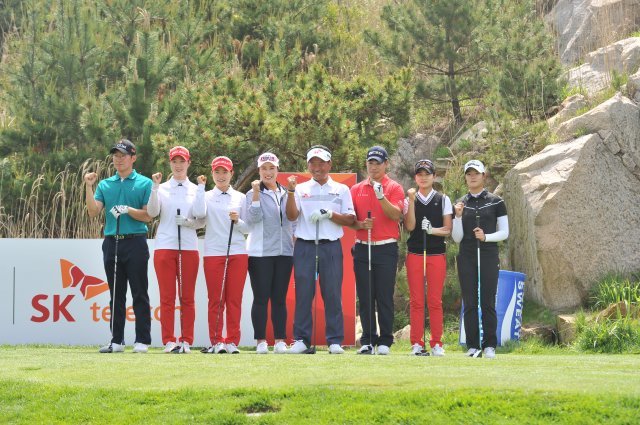 남녀 전설 15명이 한 자리에 모인 곳은 인천 영종도 스카이72 골프클럽 하늘코스였다. 17일 개막하는 한국프로골프(KPGA) 코리안 투어 SK텔레콤 오픈을 앞두고 골프 유망주 45명의 실력 향상을 위해 마련된 ‘재능나눔 행복라운드’ 무대였다.