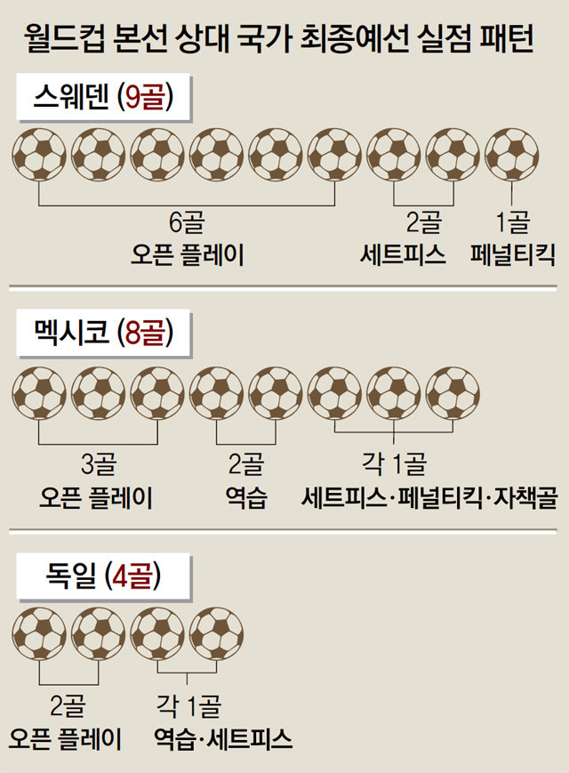 세트피스는 약팀이 강팀을 무너뜨릴 수 있는 공격 옵션이다. 스웨덴, 멕시코, 독일 등에 비해 객관적 전력에서 열세인 한국으로서는 상대 반칙 등으로 얻을 수 있는 세트피스를 적극 활용해야 한다. 스웨덴은 월드컵 최종예선에서 세트피스로 2골을 내줬다. 멕시코와 독일은 나란히 세트피스로 1실점을 했다. 첫 경기 상대인 스웨덴은 키가 190cm 이상인 장신 수비수만 3명이다. 이 때문에 파워와 조직력을 겸비한 상대 수비진을 무너뜨리기 위해서는 세밀한 세트피스 공격이 필요하다.