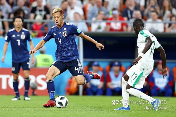 2018러시아월드컵 조별리그 H조 일본과 세네갈의 경기 중 일본 축구대표팀 혼다 게이스케(왼쪽)가 드리블을 하고 있는 모습. 사진=게티이미지코리아