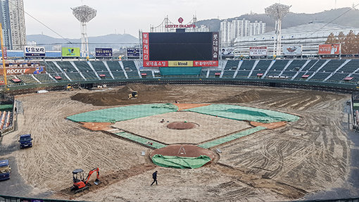 사직구장이 2019시즌을 앞두고 내·외야 잔디 전면교체 공사를 진행 중이다. 롯데 자이언츠가 8억3000만원을 지불한 뒤 부산시 측이 이를 임대료에서 차감하는 방식이다. 지난 6월 지방선거 당시 부산시장 후보자들은 약속이라도 한 듯 신구장 건립을 공약으로 내세웠지만 선거 후 이렇다할 움직임은 없는 상태다. 사직|최익래 기자 ing17@donga.com