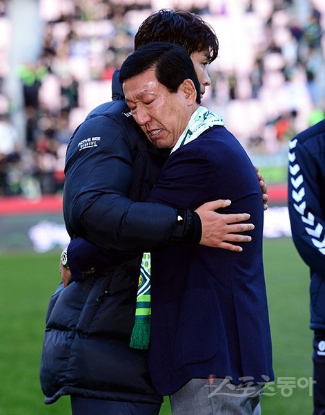2일 전주월드컵경기장에서 전북 감독으로 최종전을 치른 최강희 감독(오른쪽)이 이동국과 포옹했다. 작별의 아쉬움이 가득한 표정이 인상적이다. 전주|김민성 기자 marineboy@donga.com