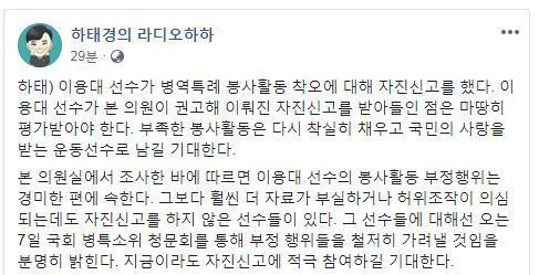 하 의원은 이날 페이스북을 통해 "이용대 선수가 병역특례 봉사활동 착오에 대해 자진신고를 했다"며 "이용대 선수가 본 의원이 권고해 이뤄진 자진신고를 받아들인 점은 마땅히 평가받아야 한다. 부족한 봉사활동은 다시 착실히 채우고 국민의 사랑을 받는 운동선수로 남길 기대한다"고 전했다.