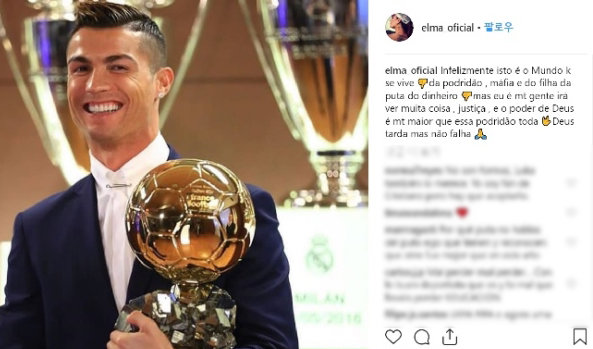 이에 호날두의 큰누나인 엘마 아베이로는 자신의 인스타그램에 관련 사진을 게재하며 “이 세상은 썩었다. 불행하게도 마치 마피아 같은 세계”라고 분노를 표했다. 이어 “하나님의 능력은 그들의 부패보다 강하다. 시간이 걸리겠지만 저버리지 않을 것이다”는 메시지를 남겼다.