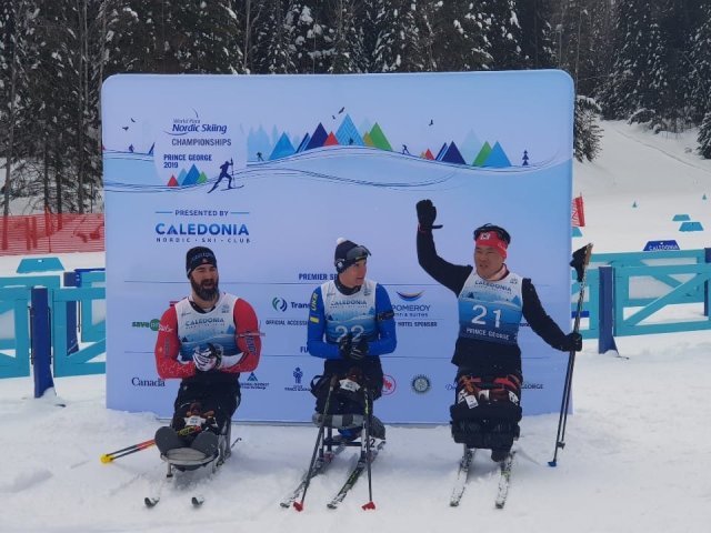 신의현(오른쪽)이 16일(현지시간) 캐나다 브리티시컬럼비아주 프린스조지에서 열린 장애인노르딕스키 세계선수권대회 바이애슬론 남자 좌식 12.5km 시상식에서 손을 흔들고 있다.