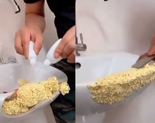 A 씨는 라면을 이용해 부서진 물건을 고치는 것으로 유명하다. A 씨의 영상은 대부분 비슷하게 시작한다. 먼저 그는 물건의 부서진 부분을 라면으로 가득 메운다. 그리고 강력 접착제로 보이는 액체를 붓는다.