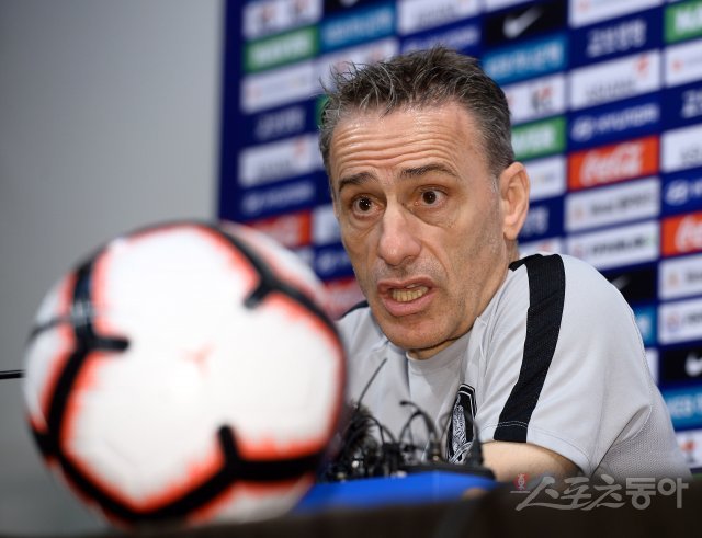 이란과 평가전을 갖는 한국 축구대표팀이 10일 파주NFC(국가대표 트레이닝센터)에 소집돼 훈련을 가졌다. 대표팀 벤투 감독이 공식 기자회견에서 취재진의 질문에 답변하고 있다. 파주 | 김진환 기자 kwangshin00@donga.com