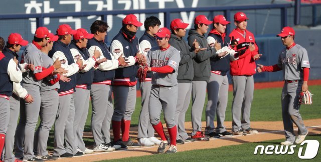 24일 오후 서울 잠실야구장에서 열린 2020 KBO리그 LG 트윈스와 SK 와이번스의 연습경기에서 4-3으로 승리한 SK선수들이 코로나19 의료진에 감사하는 ‘덕분에’ 세리머니를 하고 있다. 2020.4.24/뉴스1 © News1