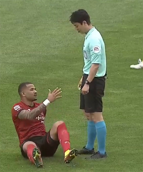 넘어진 선수가 일으켜 달라 해도 심판은 미안한 표정으로 외면해