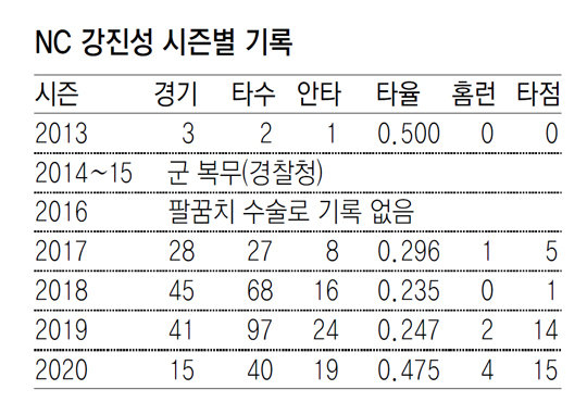 요즘 강진성의 방망이는 뜨겁다. 규정 타석을 아직 채우진 못했지만 26일 현재 팀에서 가장 높은 타율(0.475)에 최다 타점(15점)을 기록하고 있다. 홈런도 4개로 나성범(31), 박석민(35)과 함께 팀 내 공동 선두다. 26일 키움과의 경기에는 올 시즌 처음 4번 타자로 출전하기도 했다.
