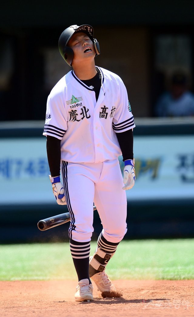 11일 서울 목동야구장에서 열린 ‘제74회 황금사자기 전국고교야구대회 겸 주말리그 왕중왕전’ 경북고와 비봉고 경기 5회초 2사 1,2루 경북고 김유성이 삼진 아웃을 당한 후 아쉬워하고 있다.