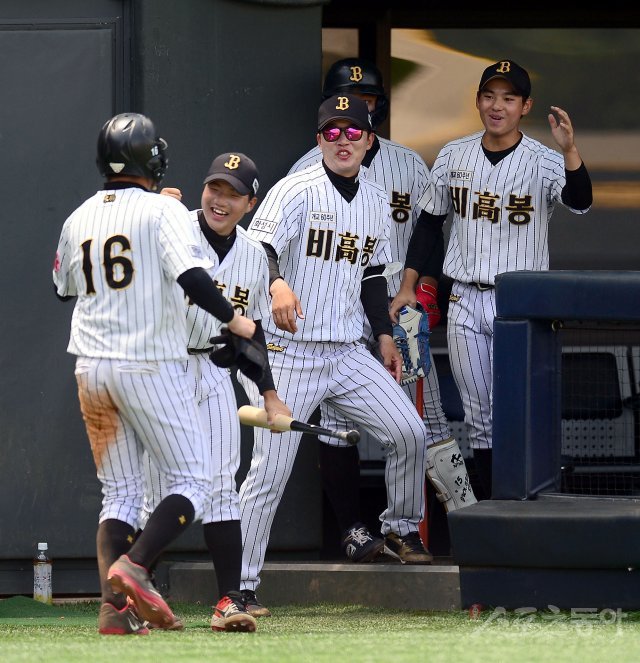 11일 서울 목동야구장에서 열린 ‘제74회 황금사자기 전국고교야구대회 겸 주말리그 왕중왕전’ 경북고와 비봉고 경기 3회말 1사 3루 비봉고 내야 땅볼 때 실책으로 득점에 성공하자 더그아웃의 선수들이 기뻐하고 있다.