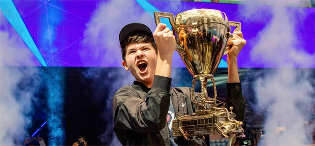 2019 포트나이트 월드컵 ‘솔로’ 부문 우승 상금으로 300만 달러를 받은 카일 기어스도프가 우승 트로피를 들고 환호하고 있다. 에픽게임즈 홈페이지