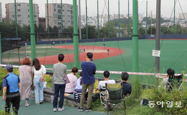 일찌감치 외야 명당자리를 잡은 학부모들이 조용한 응원을 보내고 있습니다.