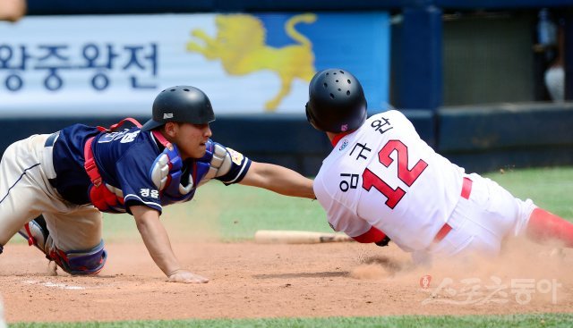 16일 서울 목동야구장에서 ‘제 74회 황금사자기 전국고교야구대회 겸 주말리그 왕중왕전’ 정읍 인상고등학교와 대전고등학교의 경기가 열렸다. 3회말 무사 1, 2루에서 대전고 조건희의 번트 때 1루 주자 임규완이 상대 실책으로 홈으로 파고 들다 인상고 박제범에게 태그 아웃되고 있다.