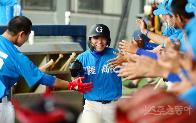 1회말 1사 3루에서 강릉고 김세민의 1타점 내야 땅볼 때 득점에 성공한 정준재가 동료들의 환영을 받고 있다.