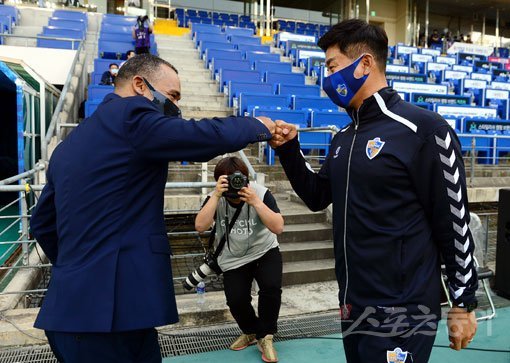 28일 울산 문수월드컵경기장에서 열린 ‘하나원큐 K리그1 2020‘ 울산 현대와 전북현대의 경기에서 전북 모라이스 감독과 울산 김도훈 감독이 인사를 나누고 있다. 울산|김민성 기자 marineboy@donga.com
