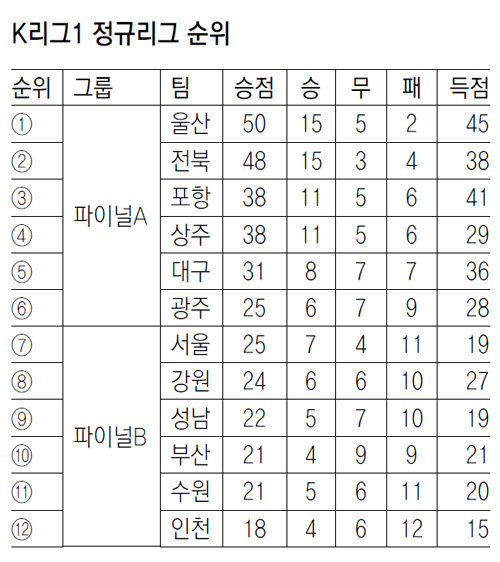 선두 울산은 최하위 인천을 1-0으로 꺾고 1위로 파이널A에 올랐다. 울산 주니오는 전반 25분 시즌 24호 골을 터뜨렸다. 전북은 2위. 포항은 상주와 승점 38로 동률을 이뤘지만 다득점에서 앞서 3위가 됐다. 상주가 4위.