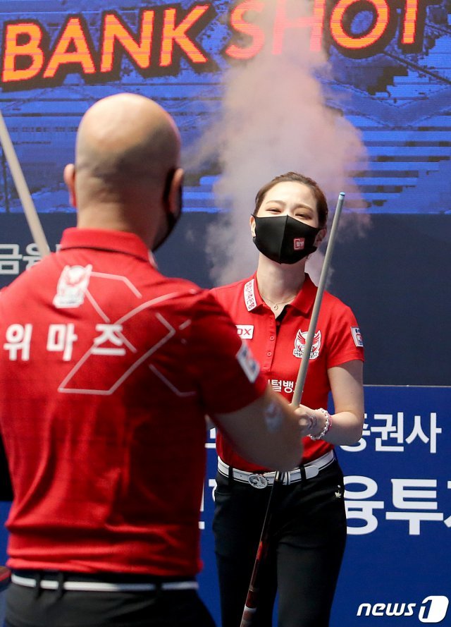 차유람이 24일 경기도 고양시 빛마루 방송지원센터에서 열린 ‘신한금융투자 PBA 팀리그 2020-21’ 2라운드에서 김가영을 만나 2승을 거뒀다. 3쿠션 전향 후 차유람이 김가영을 꺾은 것은 이날이 처음이다. (PBA 제공) © 뉴스1