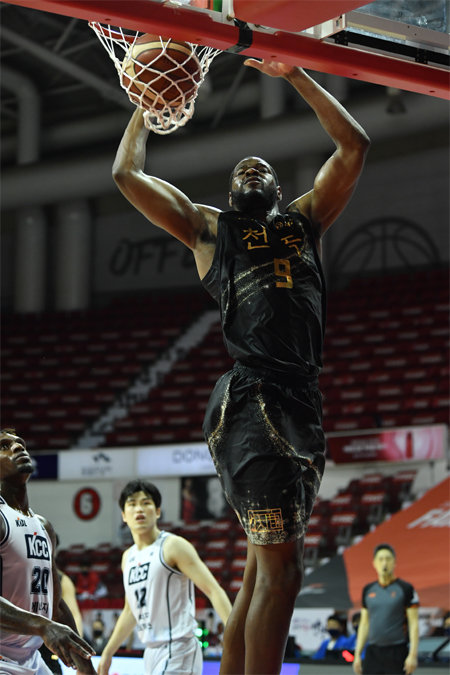 프로농구 KGC 외국인 선수 라타비우스 윌리엄스가 13일 안양실내체육관에서 열린 KCC와의 경기에서 호쾌한 덩크슛을 터뜨리고 있다. 전날까지 KCC와 함께 공동 선두였던 KGC는 83-79로 승리하며 단독 선두로 나섰다. KBL 제공