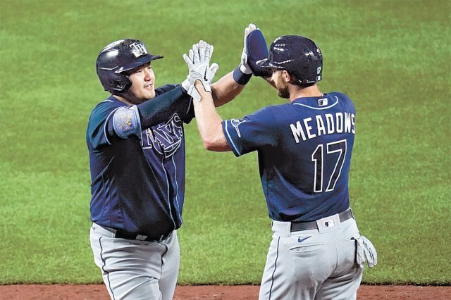 탬파베이 최지만(왼쪽)이 19일 볼티모어전에서 8회초 2점 홈런을 친 뒤 홈으로 들어오며 먼저 홈을 밟은 오스틴 메도스와 하이파이브를 하고 있다. 볼티모어=AP 뉴시스