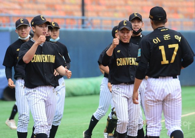 7일 서울 목동야구장에서 ‘제75회 황금사자기 전국고교야구대회 겸 주말리그 왕중왕전’ 32강 안산공고와 컨벤션고의 경기가 열렸다. 컨벤션고가 안산공고에 8-1로 7회초 콜드승을 거둔 뒤 선수들이 기쁨을 나누고 있다.