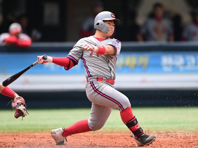 7일 서울 목동야구장에서 ‘제75회 황금사자기 전국고교야구대회 겸 주말리그 왕중왕전’ 32강 율곡고와 충암고의 경기가 열렸다. 4회말 1사 만루 충암고 김선웅이 1타점 우전 적시타를 치고 있다.