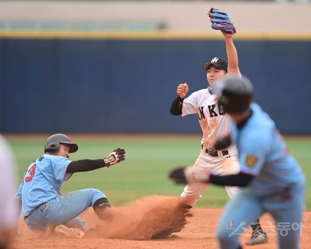 7회초 1사 1, 2루 휘문고 강성현의 투수 정면 직선타 때 인천고 2루수 김현준이 2루주자 정해원을 포스 아웃시키고 있다.