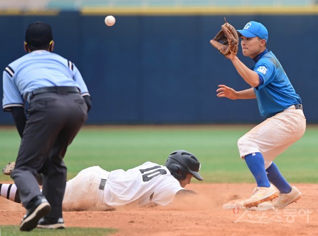 10일 서울 목동야구장에서 ‘제75회 황금사자기 전국고교야구대회 겸 주말리그 왕중왕전’ 8강전 인천고와 강릉고의 경기가 열렸다. 6회초 1사 인천고 5번 조국의 타석 때 2루주자 유혁이 견제구에 2루로 귀루하고 있다.