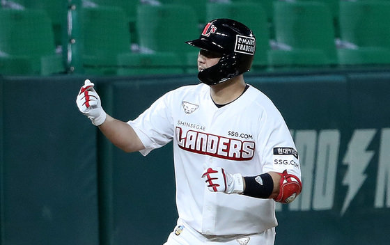 1일 인천 SSG랜더스필드에서 열린 NC 다이노스와 SSG 랜더스의 더블헤더 2차전 경기에서 8회말 무사 만루상황 SSG 최정이 홈런을 친 뒤 하트세리머니를 하며 그라운드를 돌고 있다. 2021.9.1/뉴스1 © News1