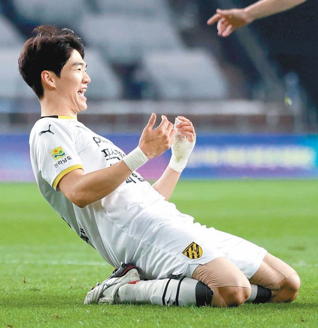 전남 장순혁이 27일 2021 하나은행 FA컵 울산과의 준결승에서 1-0으로 앞선 후반 4분 추가 골을 터뜨린 뒤 슬라이딩 세리머니를 하고 있다. 전남은 2-1로 이겨 강원을 1-0으로 꺾은 대구와 결승에서 맞붙는다. 대한축구협회 제공