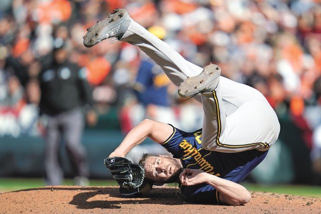 메이저리그(MLB) 밀워키의 선발 투수 에이드리언 하우저(29)가 12일 미국 메릴랜드주 오리올파크에서 열린 볼티모어와의 방문경기 4회말 선두 타자 오스틴 헤이스(27)의 타구를 글러브로 직접 잡아내며 뒤로 넘어져 구르고 있다. 하우저는 2회 2실점 이후 타선의 지원을 받지 못해 패전 투수가 됐다. 개막 후 탬파베이에 3연패를 당한 볼티모어는 이날 첫 안방경기에서 밀워키를 2-0으로 꺾으며 시즌 첫 승을 올렸다.