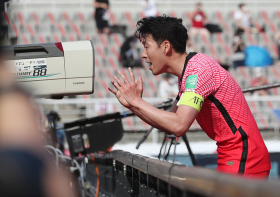13일 오후 경기 고양시 고양종합운동장에서 열린 2022 국제축구연맹(FIFA) 카타르 월드컵 아시아지역 2차 예선 대한민국과 레바논 경기 후반전에 손흥민이 페널틱킥을 성공시키고 토트넘에서 함께 했던 에릭센 선수를 응원하는 세리머니를 하고 있다. 2021.6.13/뉴스1