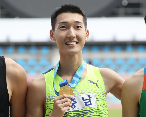 한국 높이뛰기의 간판 우상혁(서천군청)이 12일 울산종합운동장에서 열린 제103회 전국체육대회 육상 남자일반부 높이뛰기 결승 시상식에서 금메달을 들어보이고 있다. 이날 우상혁은 2m15를 넘어 금메달을 차지했다. 2022.10.12/뉴스1